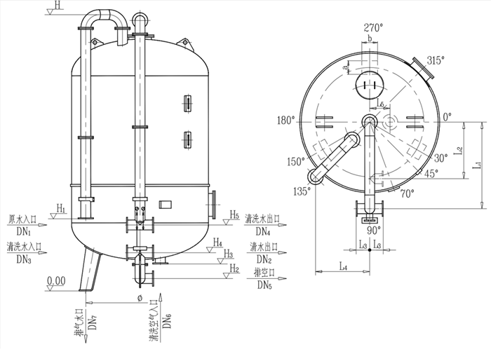 設(shè)備主要由罐體、布水系統(tǒng)、集水系統(tǒng)、濾料層、濾板水帽、承托層及罐體本體配套管路等組成。外部聯(lián)結(jié)原水進水、清水出水、反洗排水等主要管路和與其配套的控制閥、壓力表、取樣閥等。多介質(zhì)過濾器一般采用活性炭等為濾料,采用壓力式過濾。