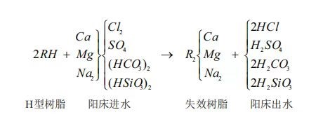 當(dāng)水通過(guò)陽(yáng)離子交換器(陽(yáng)床樹(shù)脂)時(shí),水中的各種陽(yáng)離子被樹(shù)脂中的H+,Na+離子交換后留在樹(shù)脂上,而H+,Na+離子則到了水中,鈉基樹(shù)脂一般用在軟化水處理中,鈉離子置換掉水中的鈣鎂離子,降低水中的鈣鎂硬度。氫基樹(shù)脂陽(yáng)床離子交換器一般和陰床離子交換器共同使用,或者使用在混床離子交換器中。水中的陽(yáng)離子被H+置換后,陽(yáng)床出水含有H2SO4,、HCl等強(qiáng)酸,一級(jí)H2CO3,H2SiO3等弱酸,因此呈酸性,這些水進(jìn)入到陰離子交換器后,水中的各種陰離子被OH+離子置換,OH+離子被置換到水中,和H+離子結(jié)合成水,反應(yīng)式如下: