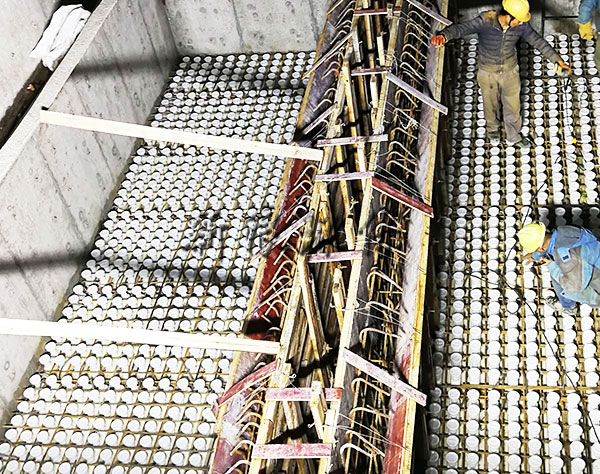 生物曝氣濾池由于濾料層厚,負(fù)荷高,加上曝氣量大,頻繁的曝氣往往造成小塊預(yù)制濾板的預(yù)埋螺栓松動,濾板之間接縫裂開,甚至翻板等事故。整體澆筑濾板沒有螺栓,不會產(chǎn)生螺栓松動之弊病,加上與池壁都有預(yù)埋鋼筋網(wǎng)狀聯(lián)結(jié),整體性好,性能十分優(yōu)越。