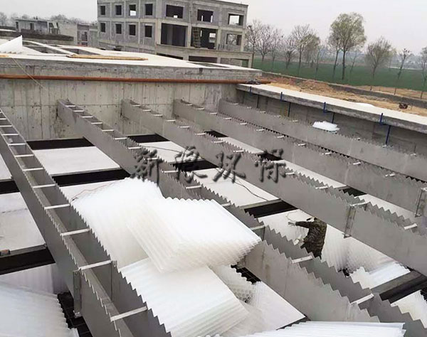 齒形集水槽(三角堰板式)兩側(cè)采用齒形堰板與槽體側(cè)板拼裝而成,拼裝孔為囊性具有可調(diào)性,堰齒角度為90度,